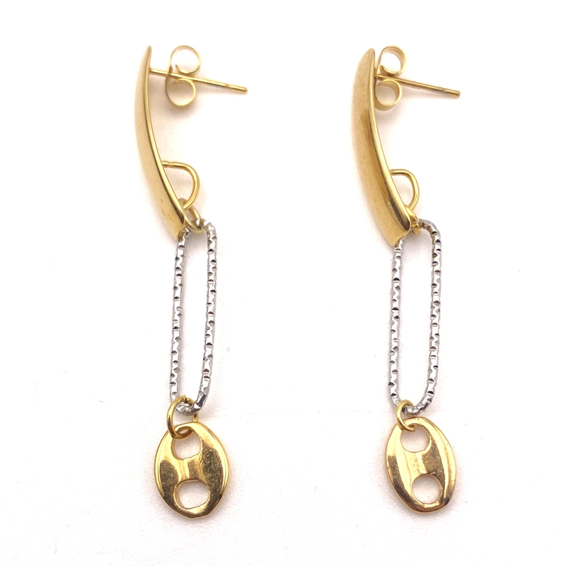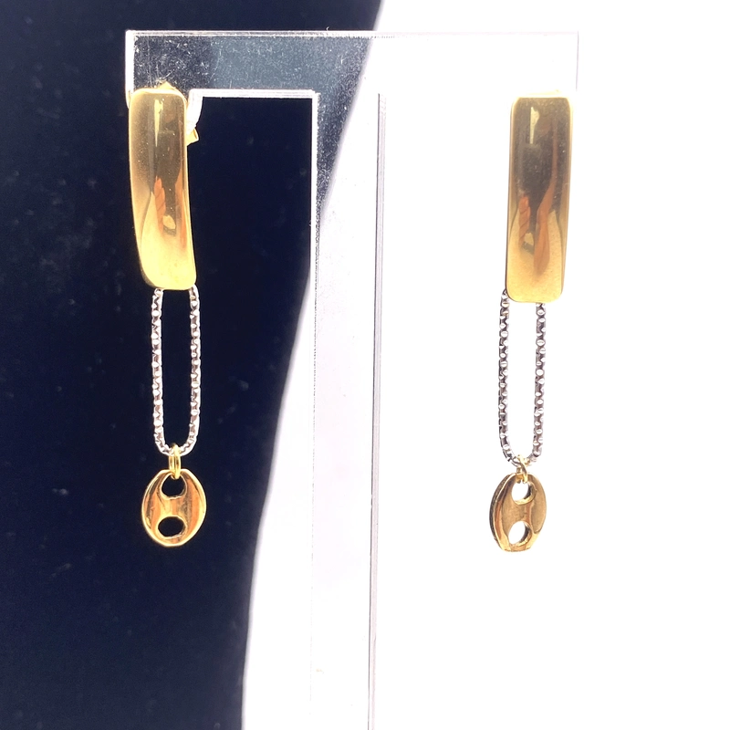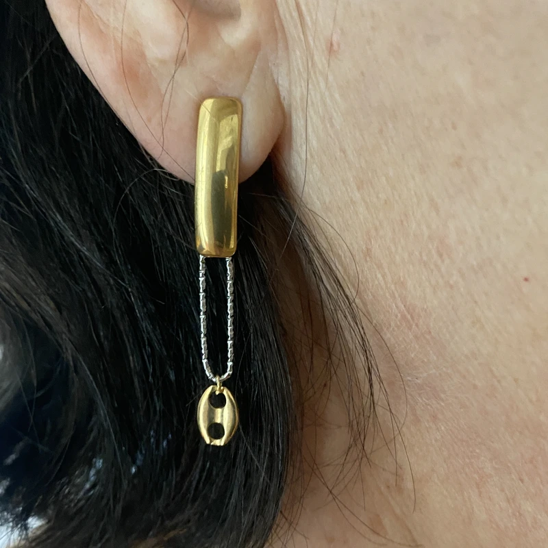 Boucles d’oreilles mix or argent avec maillon grain de café pendant . Boucles d’oreilles pour oreilles percées avec mélange de couleur argent et or. Boucles d’oreilles faciles à porter en toute occasion, elles sont à la fois avant-garde et discrètes. Bijou upcyclé.