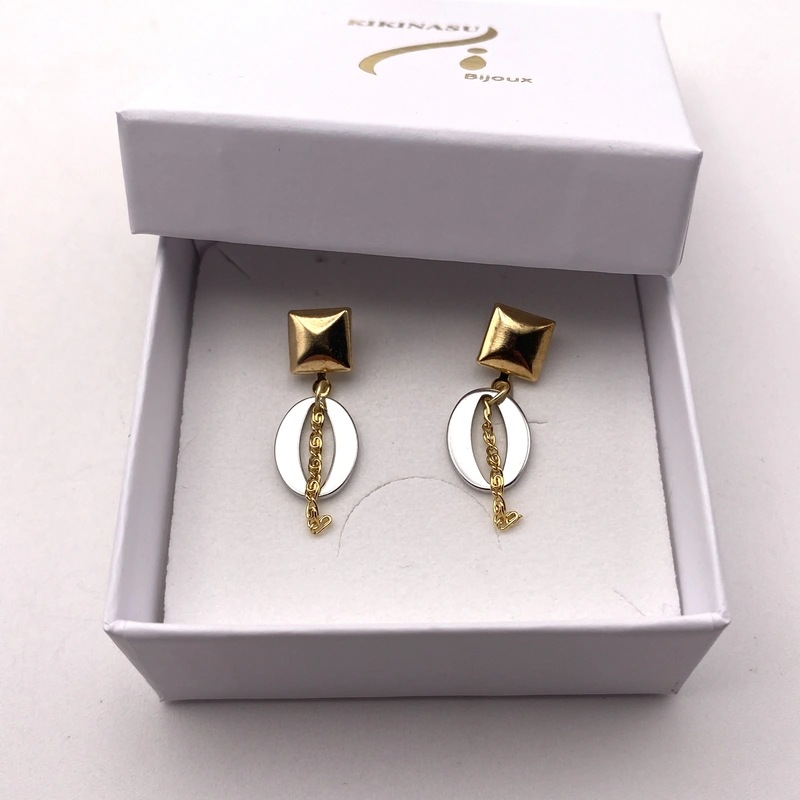 - Boucles d’oreilles mix or et argent avec maillon et chaine en pendant