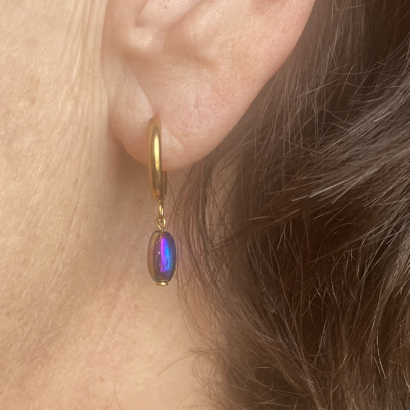 - Petites créoles avec pendant perle de verre irisée, perle iridescente au reflet arc-en-ciel